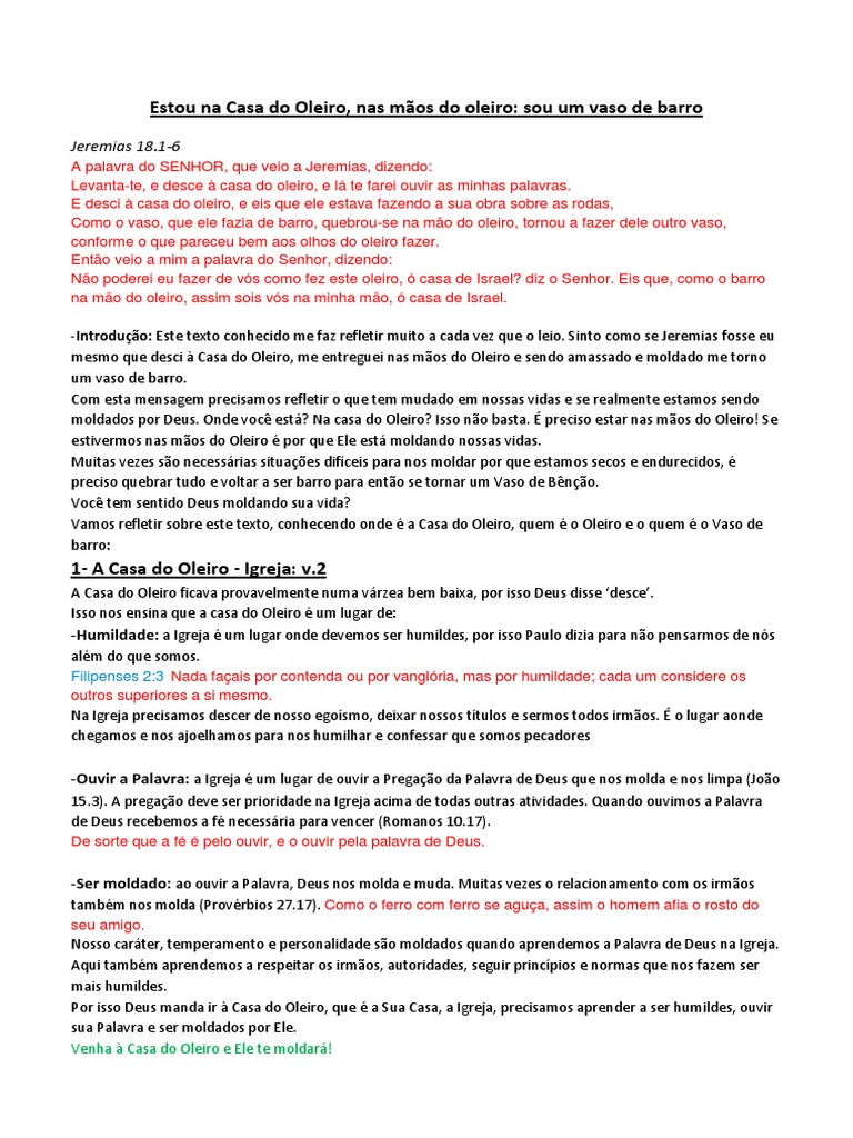 . A construção de um vaso (Jr 18. 1-6) - Estudos Bíblicos O vaso na mão do Oleiro - Jeremias 18:1–6 - Portal Revelação O Oleiro e o Vaso - Encontro da vitória - IGREJA CASA DE ORAÇÃO CEHAB